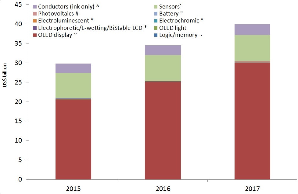 IDTechEx find that the total market for printed, flexible and organic electronics will grow from $29.80 billion in 2015 to $73.69 billion in 2025. The majority of that is OLEDs (organic but not printed) and conductive ink used for a wide range of applications. On the other hand, stretchable electronics, logic and memory, thin film sensors are much smaller segments but with huge growth potential as they emerge from R&D.
