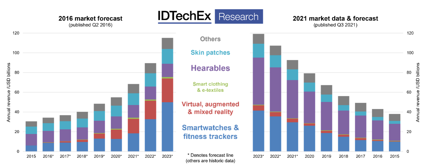In diesem Artikel wird IDTechEx etwas tun, was für ein Marktforschungsunternehmen relativ ungewöhnlich ist: alte Prognosen öffentlich mit dem vergleichen, was tatsächlich eingetreten ist. Es gibt mehrere klare Gründe, warum dies normalerweise nicht gemacht wird. In erster Linie liegt es daran, dass Marktprognosen einen Standpunkt zu einem bestimmten Zeitpunkt darstellen, der von bedeutenden Annahmen abhängig ist, mit Produkt- oder Sektordefinitionen, die sich im Laufe der Zeit ändern können, und mit einer begrenzten Menge an Wissen und Ressourcen hinter der Prognose. Als solche sind sie selten perfekt (insbesondere bei längeren Zeiträumen), aber eine gute Prognose sollte die wichtigsten Themen innerhalb eines Sektors, die allgemeine Richtung der Entwicklung einer Branche und vor allem die Kernaussage hinter den Zahlen erfassen. Indem IDTechEx für diesen Artikel auf alte Prognosen zurückblickt, hofft es, einige Lehren zu ziehen, sowohl über die Wearables-Branche als auch über Marktprognosen im Allgemeinen.