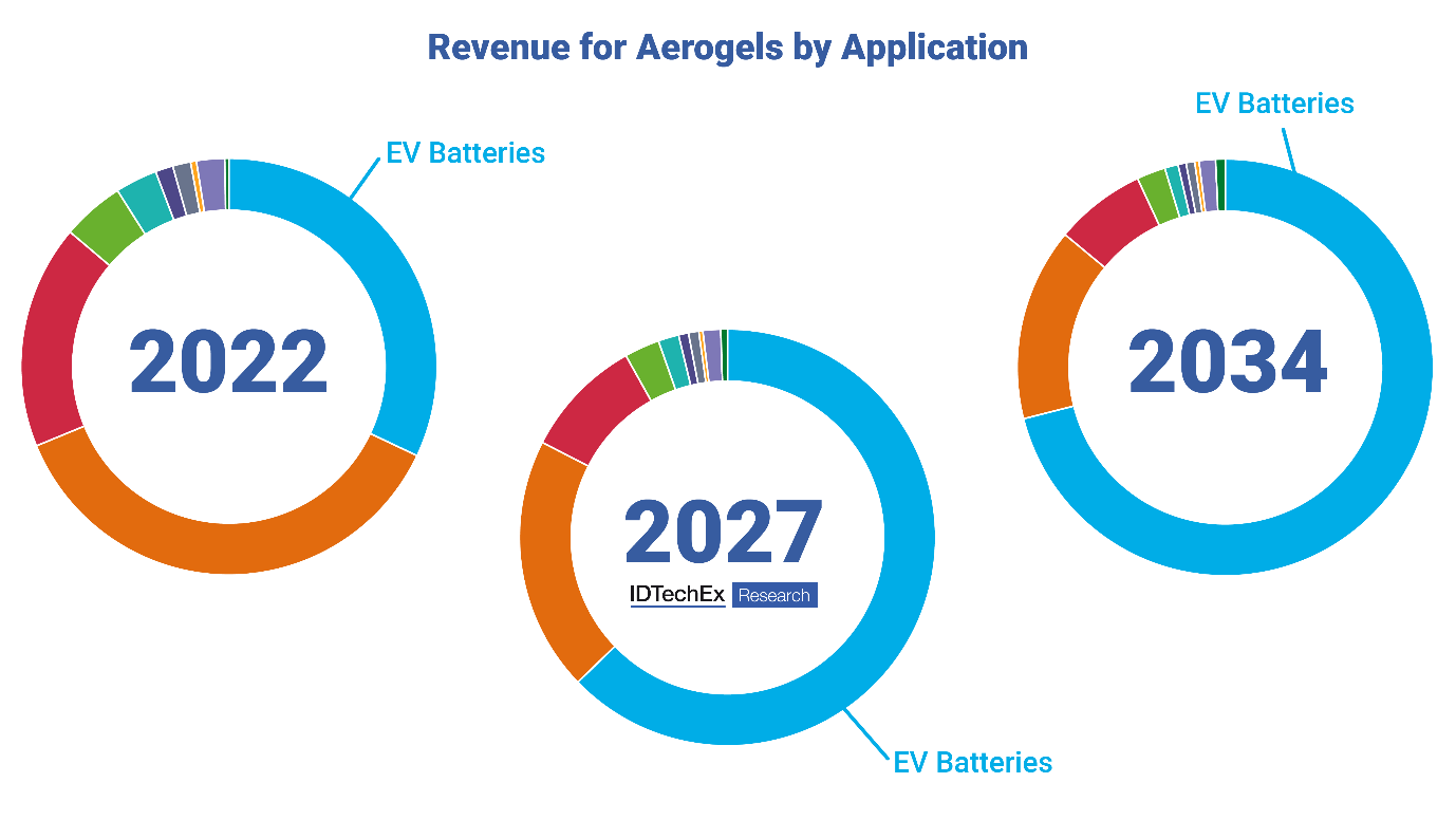 Der Aerogel-Markt ist stetig gewachsen, aber die Elektrofahrzeuge werden den Markt schnell wachsen lassen. IDTechEx prognostiziert, dass der Gesamtmarkt für Aerogel bis 2034 mehr als 2,6 Milliarden US-Dollar betragen wird, wobei der größte Teil auf Elektrofahrzeugbatterien entfällt. Mehrere andere Materialien werden in diesem Bereich konkurrieren, aber Aerogele werden zu einer Standardoption werden.