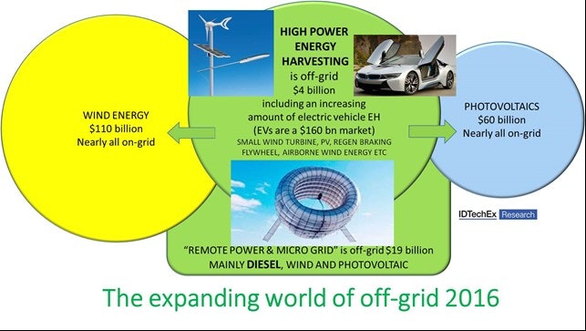As new research by IDTechEx reveals though, remote power and micro-grid applications are currently a $19 Billion market, and what is defined as "high power energy harvesting" for off grid PV and small wind turbines, regenerative braking in vehicles, etc. could lead to new opportunities for technology developers. That's already a market of $1.6 Billion in 2016 and is expected to grow over the next decade as distributed power usage paradigms become increasingly popular, not just in remote parts of the world but also in urban application environments.