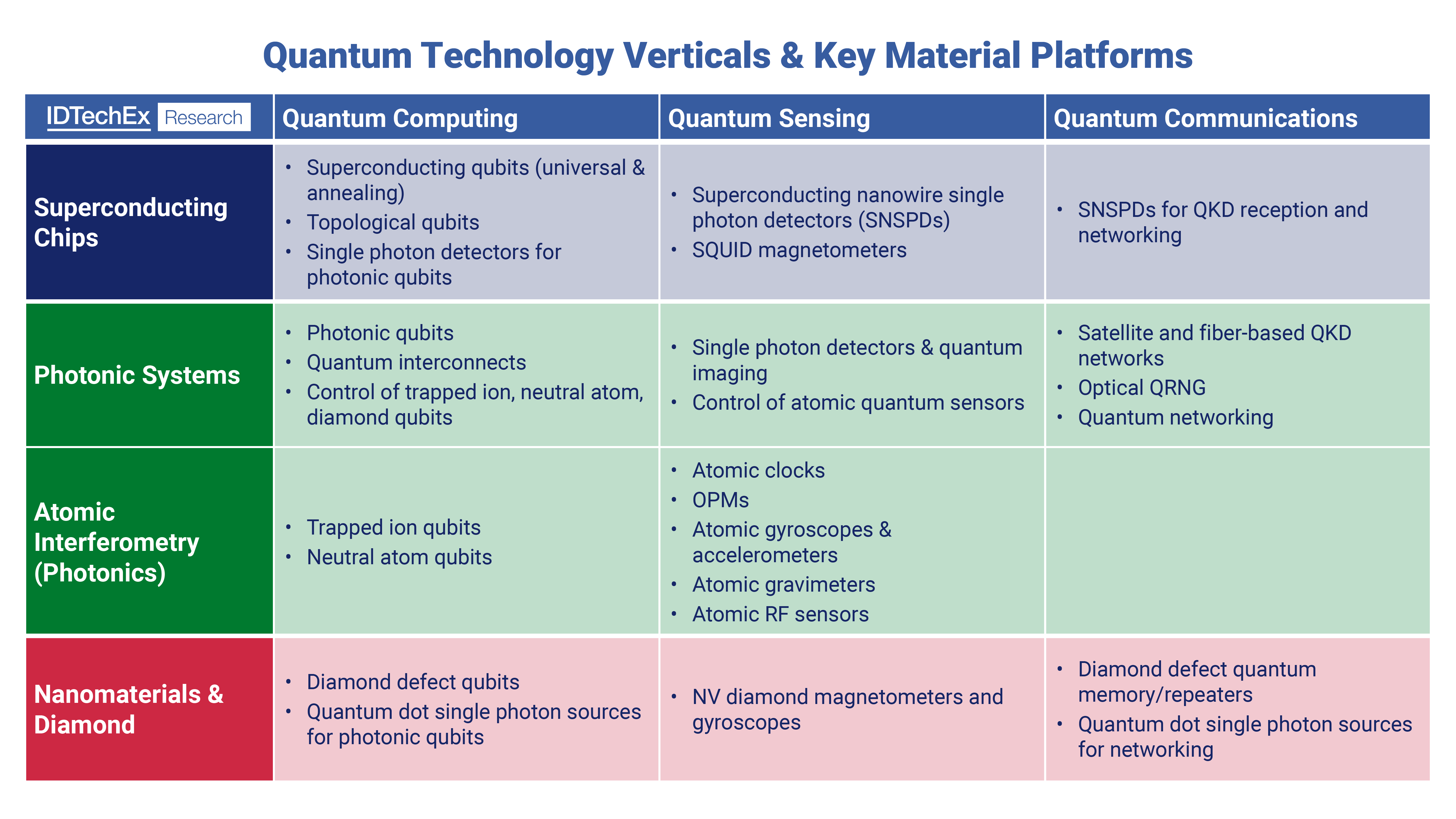 In commercial and government strategies, and in IDTechEx's portfolio of reports on quantum technologies, the market is usually categorized by the three core product verticals: quantum computing, quantum sensing, and quantum communications. For a materials provider, it may instead be more informative to categorize quantum technologies by the physical 'platform' or quantum system they are built on.