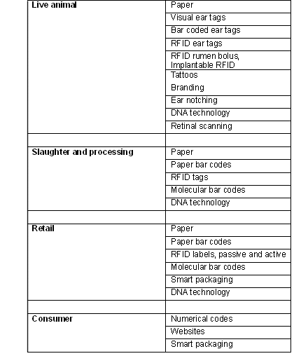 There are a variety of methods available which allow identification and traceability of an animal or product but RFID will be the most widely used method with supplementary technologies such as DNA testing playing a vital part, particularly as they become fast, low-cost and deskilled. Solutions are shown in the table below.