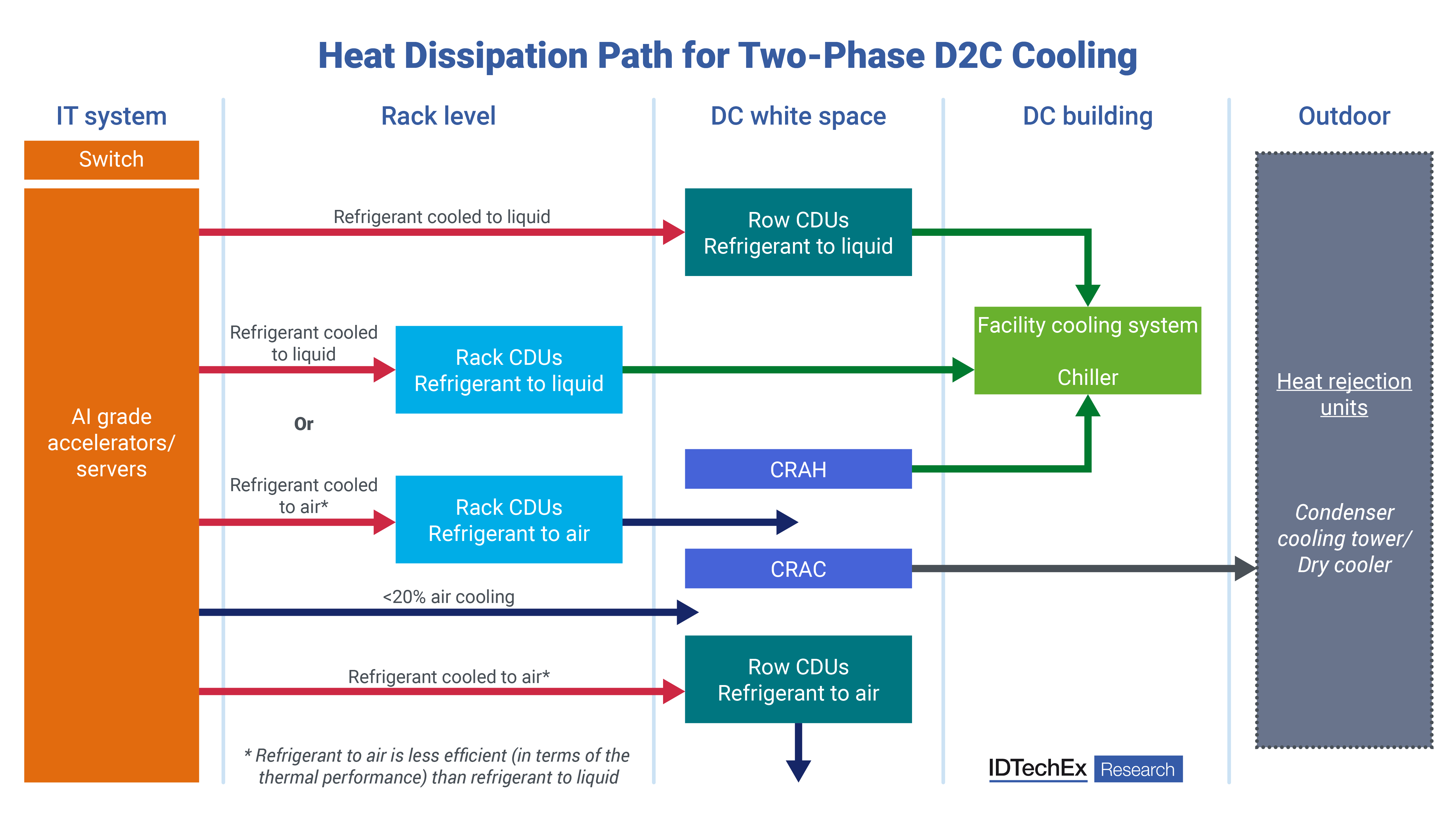 An overview of the heat dissipation path for two-phase D2C cooling. Source: IDTechEx, Thermal Management for Data Centers 2026-2036