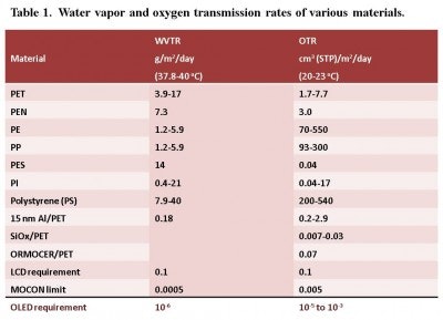 In order to achieve device lifetimes of tens of thousands of hours, water vapor transmission rates (WVTR) must be 10-6 g/m2/day, and oxygen transmission rates (OTR) must be < 10-3 cm3/m2/day. For Organic Photovoltaics, the required WVTR is not as stringent as OLEDs require but is still very high at a level of 10-5 g/m2/day. These transmission rates are several orders of magnitude smaller than what is possible using any plastic substrate, and they can also be several orders of magnitude smaller than what can be measured using common equipment (MOCON) designed for this purpose (Table 1). For these (and other) reasons, there has been intense interest in developing transparent barrier materials with much lower permeabilities.