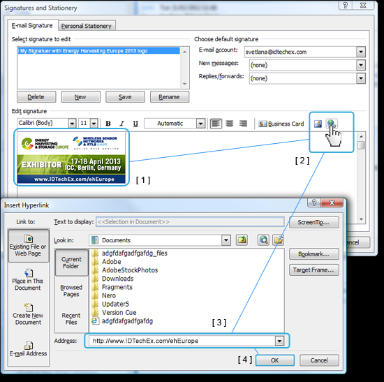 Click the banner image to select it. [1] Click the "link" icon [2] Type the conference web-address in the address box [3] (! Important: Always begin with http://www) Click Ok to apply your changes and close all dialog windows.[4] |
