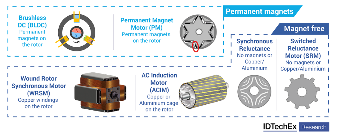 Hay varias tecnologías de motores que pueden evitar los imanes permanentes. Fuente: IDTechEx - "Motores eléctricos para vehículos eléctricos 2024-2034"