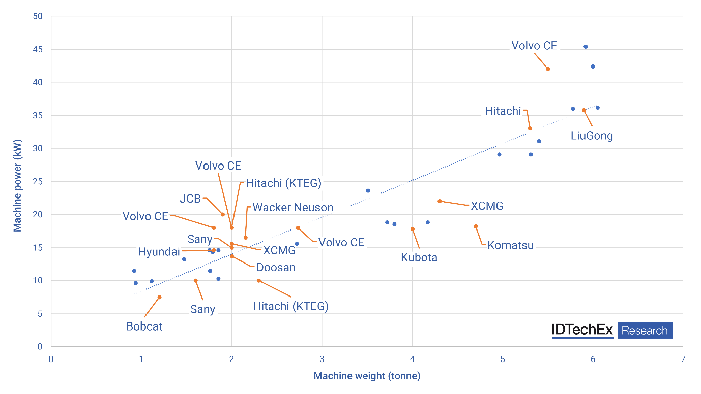 Una de las principales preocupaciones que pueden tener los profesionales de la construcción a la hora de pasarse a la electricidad es si las nuevas máquinas tendrán la potencia necesaria para realizar el trabajo. El informe "Electric Vehicles in Construction 2023-2043" de IDTechEx concluye que, en muchos casos, las máquinas eléctricas tienen una potencia equivalente o incluso superior a la de sus homólogas diésel. Quizá uno de los mejores ejemplos de ello sea la JCB 19C-1E, cuyo motor tiene una potencia máxima de 20 kW, aproximadamente un 33% más que los ejemplos diésel de la base de datos de IDTechEx, y casi el doble que el motor de 11,7 kW del equivalente diésel 19C-1 de la propia JCB.