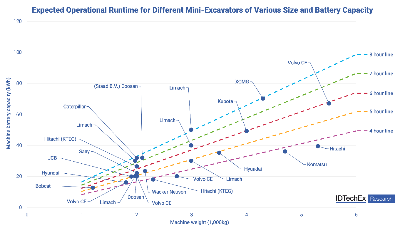 Duración prevista de las baterías de una gama de miniexcavadoras eléctricas. Fuente: IDTechEx