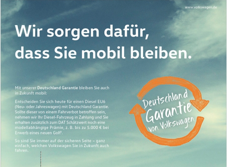 The Volkswagen brand is starting a diesel campaign for its customers in Germany the month. The new Germany Guarantee gives the buyers of new and year-old vehicles with diesel engines purchased from a Volkswagen dealership additional security and will keep them on the road in the event of a driving ban.