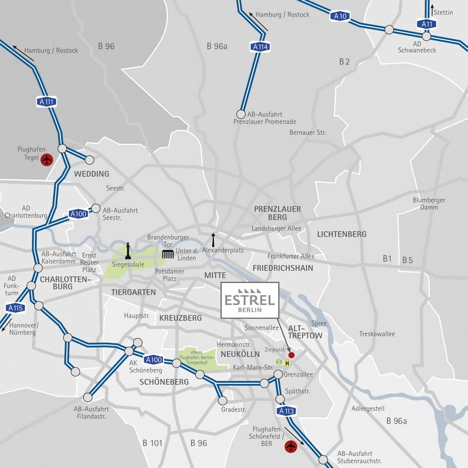 Take the A24 Dreieck Havelland interchange onto A10 / Berliner Ring toward Berlin, then change onto the A111 autobahn in the direction Flughafen Tegel / Berlin-Zentrum / Berlin-Reinickendorf. Shortly afterwards take the A100 autobahn. Take exit 26 "Grenzallee" and follow the construction detour signs that will take you via Bergiusstraße, Haberstraße and Neuköllnische Allee and bring you onto Grenzallee. At the traffic light intersection that follows, turn left on Sonnenallee. After approximately 500 meters, the Estrel is on the right hand side.