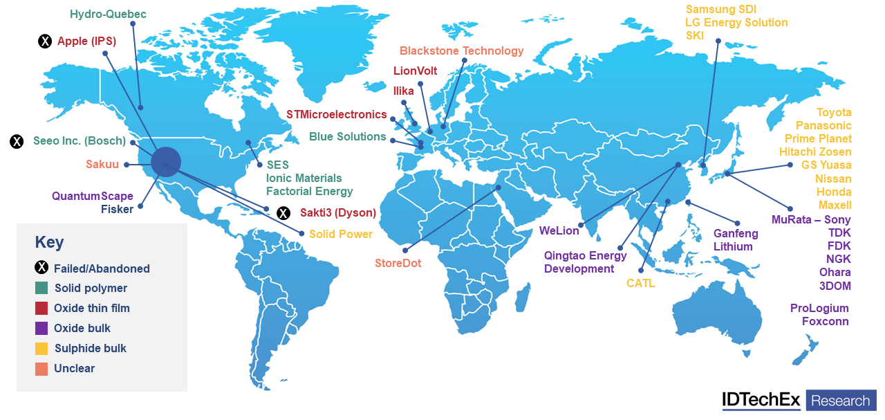 Principaux acteurs mondiaux dans le domaine des piles à l'état solide. Source : IDTechEx - "Solid-State and Polymer Batteries 2023-2033 : Technology, Forecasts, Players"