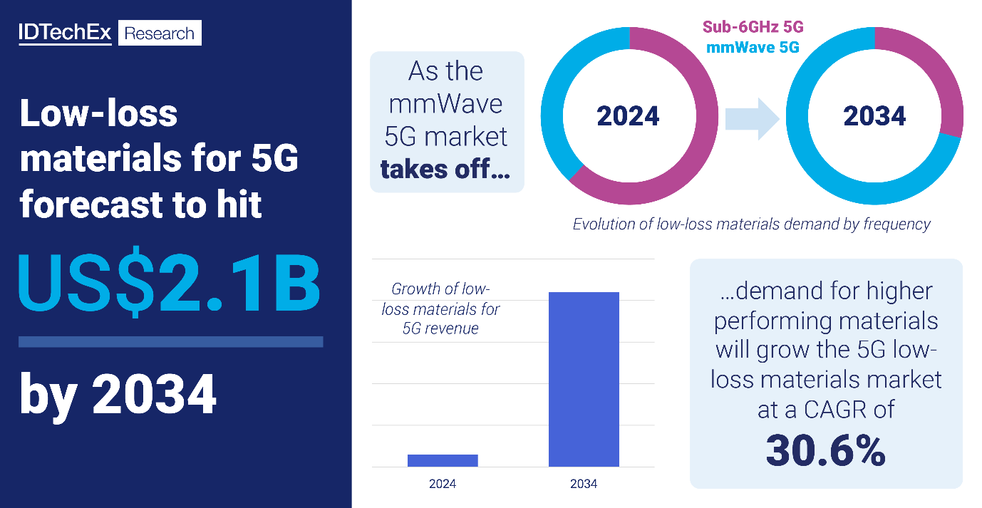 Selon IDTechEx, le marché des matériaux à faible perte pour la 5G, soutenu par la 5G à ondes millimétriques, dépassera les 2,1 milliards de dollars US d'ici 2034