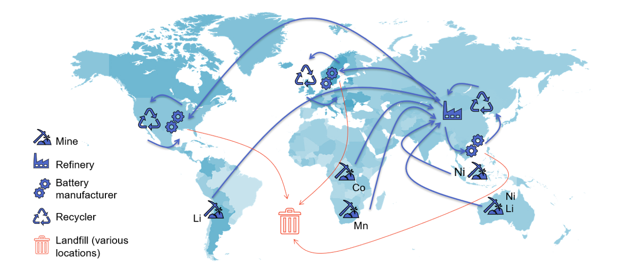Il riciclaggio offre una soluzione parziale ai problemi di sostenibilità e di catena di approvvigionamento affrontati dall'industria degli ioni di litio, fornendo un certo grado di circolarità - i materiali dai rifiuti e dalle batterie a fine vita possono essere estratti e raffinati per essere riutilizzati nella produzione di celle e batterie. Questo può avere diversi impatti positivi. Può diversificare le forniture di materiali, aiutando a ridurre la dipendenza da un singolo paese o regione. Dal punto di vista ambientale, il riciclaggio degli ioni di litio, specialmente attraverso percorsi idrometallurgici o di riciclaggio diretto, dovrebbe ridurre i requisiti energetici totali della produzione di una cella, rispetto all'utilizzo di materiali vergini. Anche altre emissioni, tra cui SOx, NOx e particolato, oltre al CO2, dovrebbero essere inferiori utilizzando materiale riciclato rispetto all'estrazione primaria. Le capacità locali di riciclaggio e raffinazione, come stanno cominciando ad essere costruite in Europa e negli Stati Uniti, possono anche ridurre la distanza percorsa dai materiali riducendo ulteriormente il profilo delle emissioni delle batterie Li-ion. Tuttavia, anche se si costruisse una capacità di riciclaggio sufficiente per gestire l'intero volume di rifiuti delle batterie Li-ion entro il 2030, il materiale riciclato potrebbe contribuire solo a una frazione della domanda di materiale.