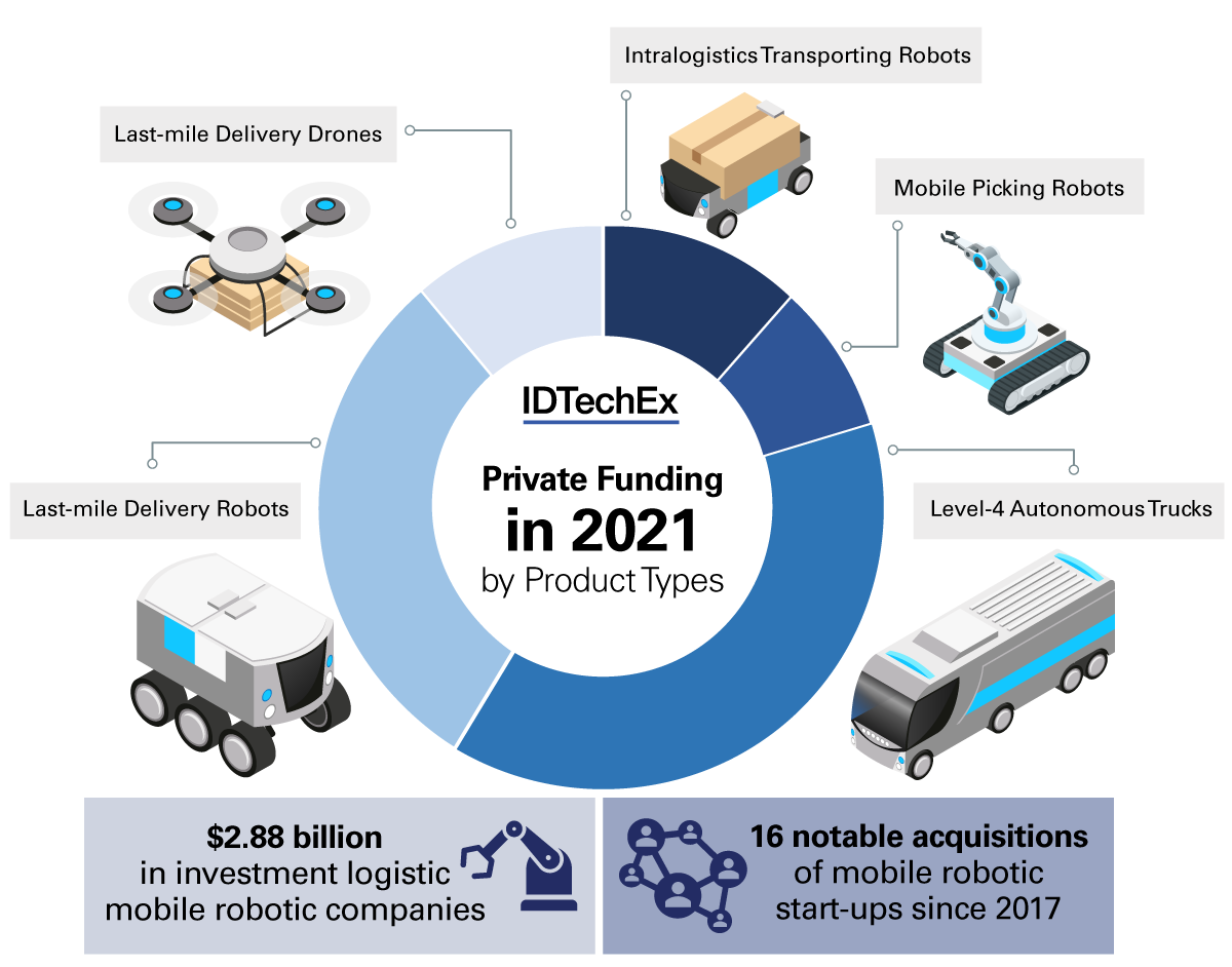 La robotica mobile, come illustrato nel nuovo rapporto IDTechEx, può essere utilizzata per automatizzare una serie di operazioni logistiche, tra cui la movimentazione dei materiali, il prelievo dei materiali, la distribuzione a lungo raggio e la consegna dell'ultimo miglio. Alcune applicazioni della robotica mobile, tra cui il trasporto di materiali tramite veicoli guidati automatizzati (AGV), sono già industrie mature che attraggono miliardi di dollari di entrate annuali, mentre altre, come la consegna completamente autonoma tramite droni, sono ancora emergenti e potrebbero raggiungere una commercializzazione su larga scala solo dopo questo decennio. Nonostante lo stadio del mercato, maturo o emergente, ogni mercato è così attivo che attira milioni o addirittura miliardi di dollari di investimenti ogni anno. Inoltre, recentemente un certo numero di start-up di robotica mobile sono state acquisite da giganti della tecnologia o dell'ingegneria; esempi notevoli includono le acquisizioni di Toyota, Amazon, Teradyne, Apple e ABB, indicando i loro ulteriori passi verso l'ingresso nel settore della robotica mobile logistica.