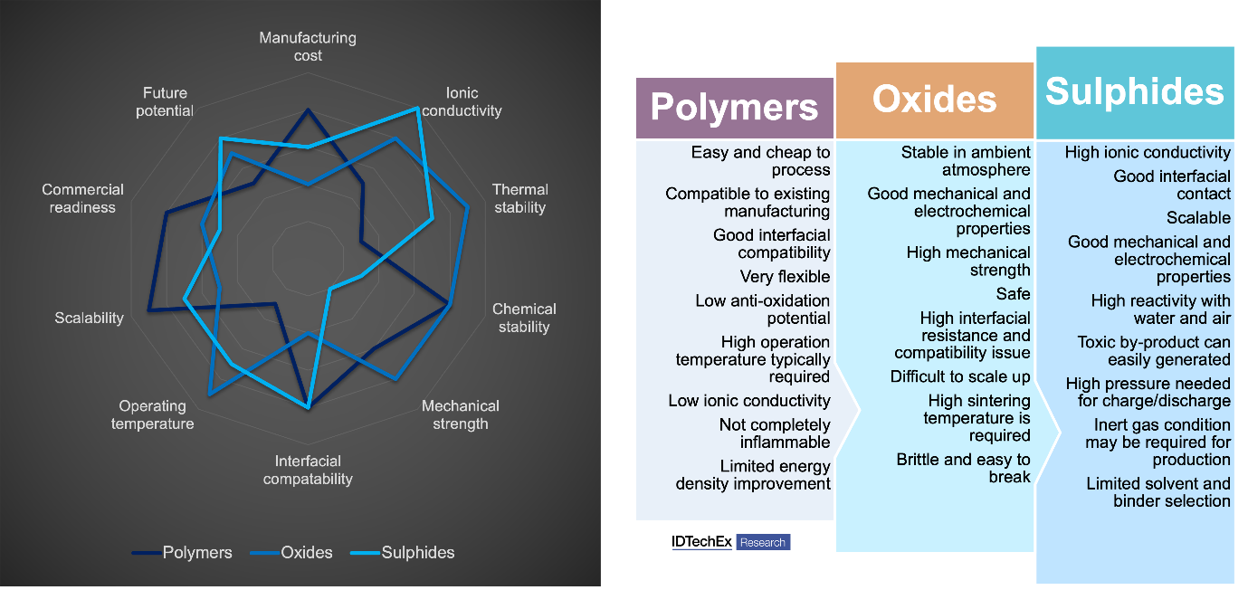 Confronto tra batterie allo stato solido. Fonte: IDTechEx - "Batterie a stato solido e polimeri 2023-2033: Tecnologia, previsioni, operatori".
