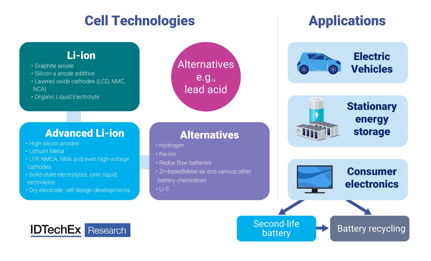 IDTechEx studia i temi dell'accumulo di energia da diversi punti di vista, dai materiali alle tecnologie delle celle, dalle applicazioni mirate a come gestirle a fine vita. Sia le tecnologie avanzate agli ioni di litio che le alternative hanno attirato un'enorme attenzione. Tra queste, le batterie allo stato solido, che si basano su innovazioni dell'elettrolita allo stato solido, hanno portato a discussioni crescenti e a continui investimenti. Come innovazione nell'elettrolita, le batterie allo stato solido possono lavorare anche con altre innovazioni come il litio metallico, l'anodo di silicio, i catodi ad alta tensione, i nuovi design delle celle, la produzione a secco, ecc.