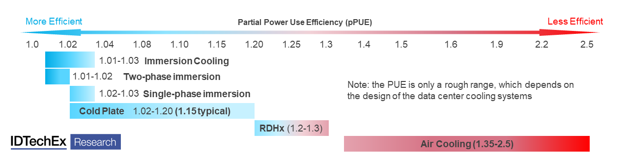 Efficacia parziale del consumo di energia (pPUE) per gli approcci di raffreddamento dei centri dati. Fonte: IDTechEx