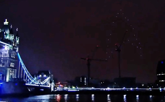 As a harbinger for the Paramount film "Star Trek - Into Darkness", starting in May in Europe's cinemas, last night a swarm of 30 mini-helicopters equipped with the LED lights drew the Star Trek logo in the skies over London.