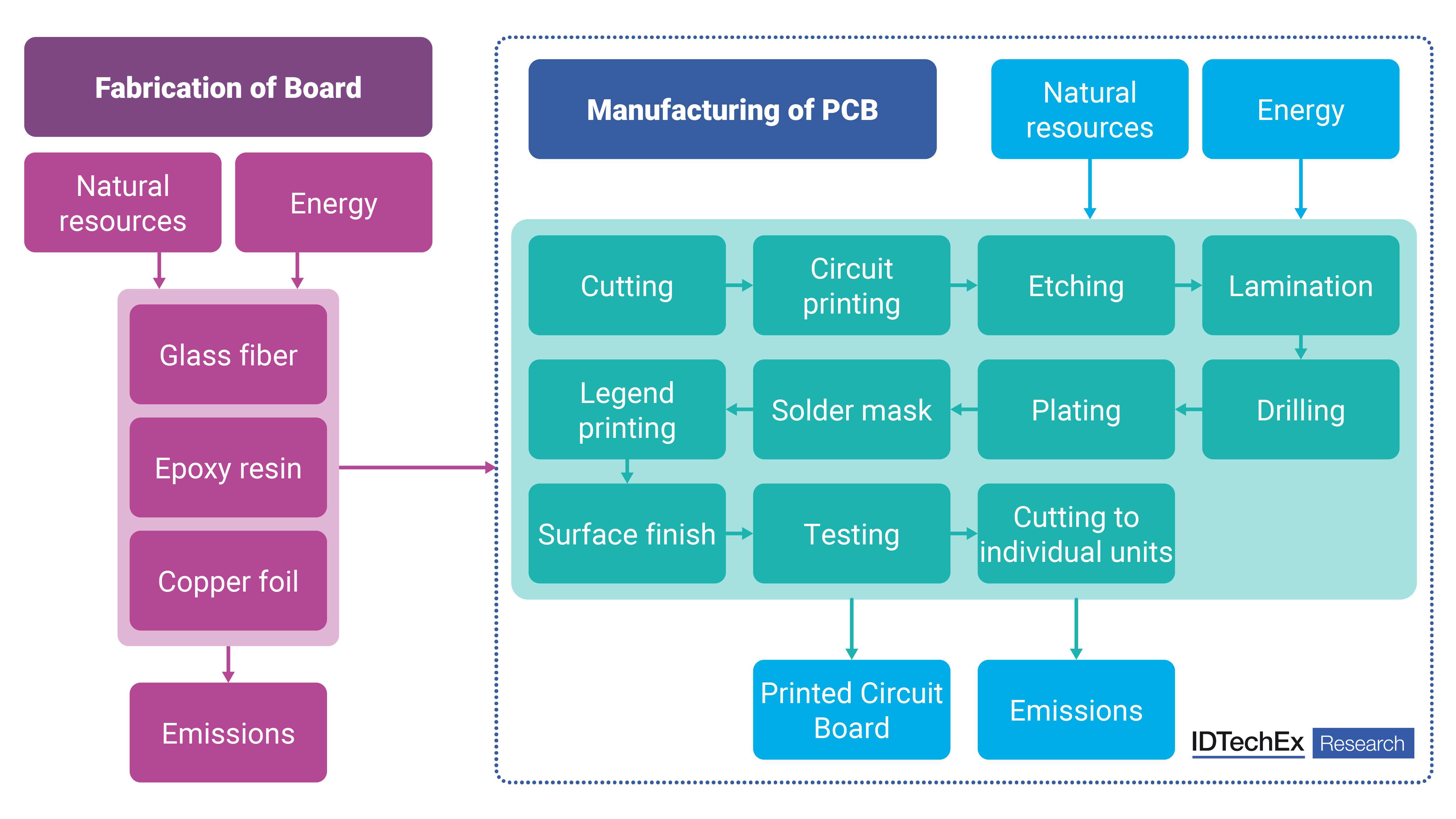 従来型PCBの製造工程図。廃棄物と排出物の発生源が複数存在。出典:IDTechEx