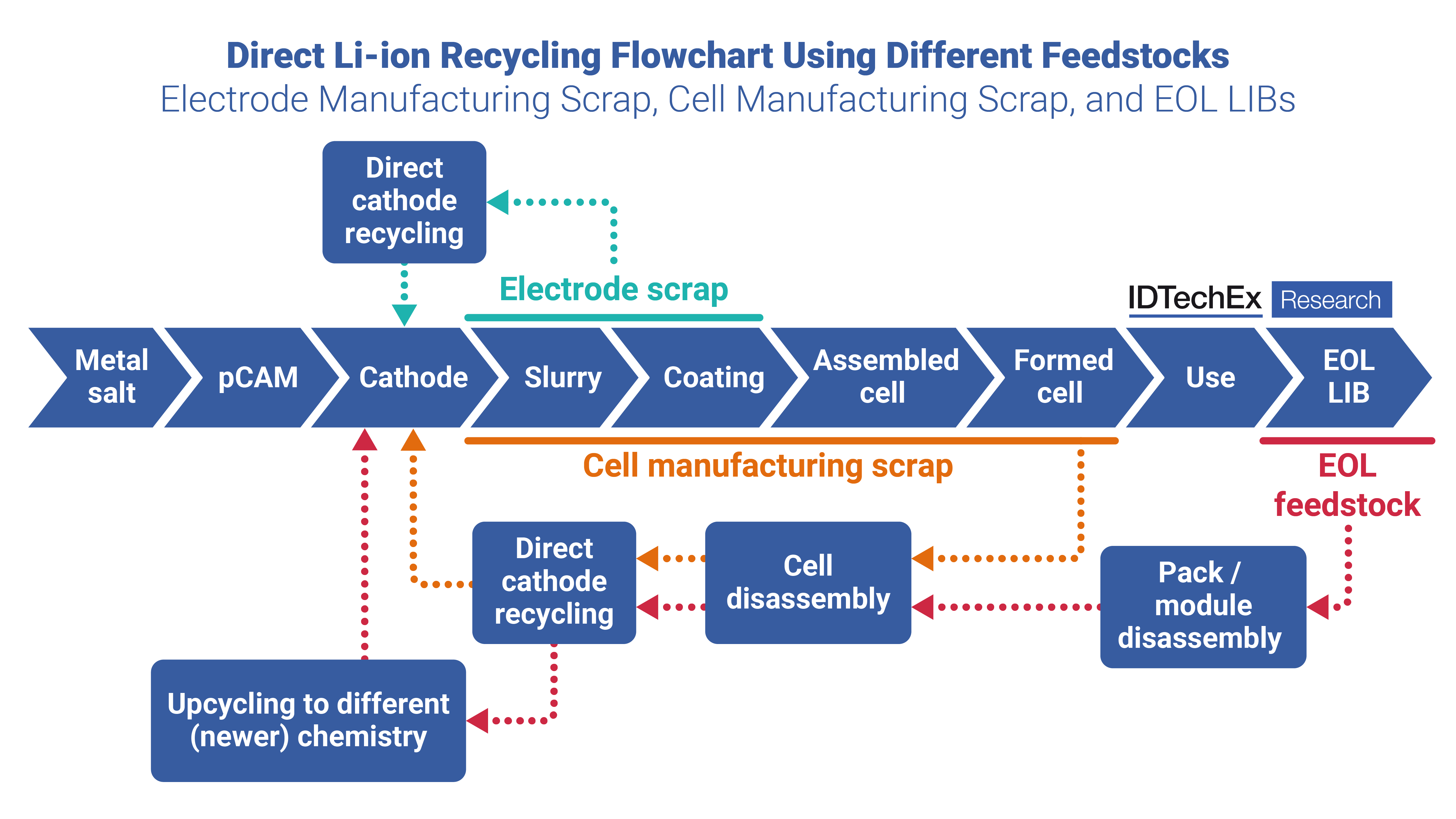 各種原料(電極製造スクラップ、セル製造スクラップ、使用済みLIB)を用いたLIBダイレクトリサイクルのフローチャート。出典:IDTechEx