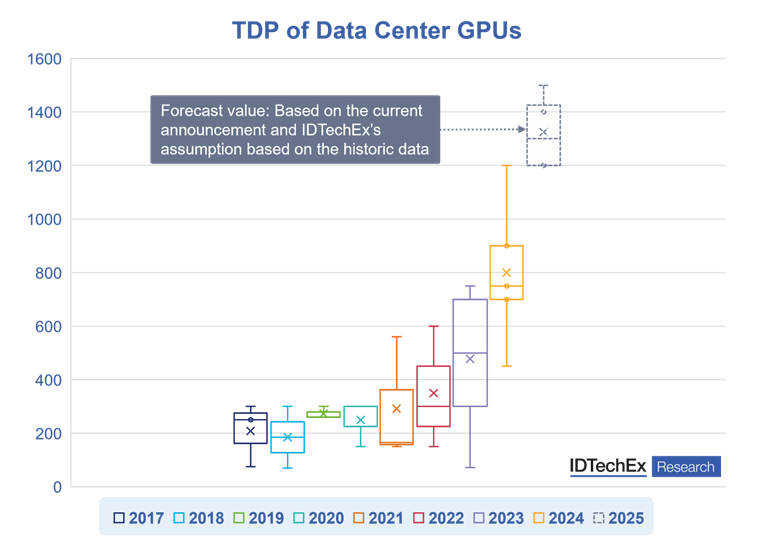 データセンター向けGPUのTDP:実績データと2025年価値予測。出典: IDTechEx調査レポート「データセンターの熱管理 2025-2035年:技術、市場、機会」