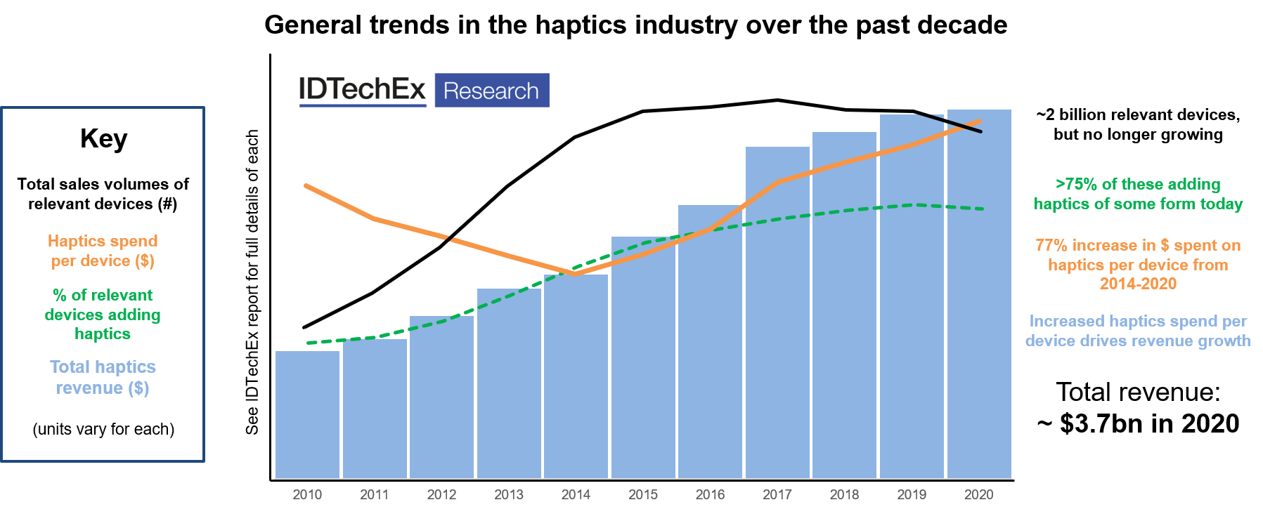 各企業が最高の新型電子デバイスを発売しようと競い合う中で、デバイスが提供する様々な機能やコンポーネントが競合他社との差別化要因となります。こうしたコンポーネントへの投資は、時とともに変化します。特定の年や製品サイクルにおいては、プレイヤーは、自身を抜きんでた存在にすることを可能にするコンポーネントや機能を開発して勝利を収めることで、ひしめき合うその他大勢から差別化することができます。これは、高性能カメラや画像認識処理装置、5Gコネクティビティ、全く新しいディスプレイ装置やインターフェースであるかもしれません。ハプティクスは、これらの中でもあまり脚光を浴びていないものの1つですが、見出しを飾ることはめったになくても、デバイスの使用体験全体に大きく貢献しているのです。ハプティクスに対する投資と開発の取り組みは加速しており、これらキーコンポーネントを支えるアクチュエータ、ドライバー、ソフトウェアを提供するサプライチェーンは、年々速度を上げて発展しています。