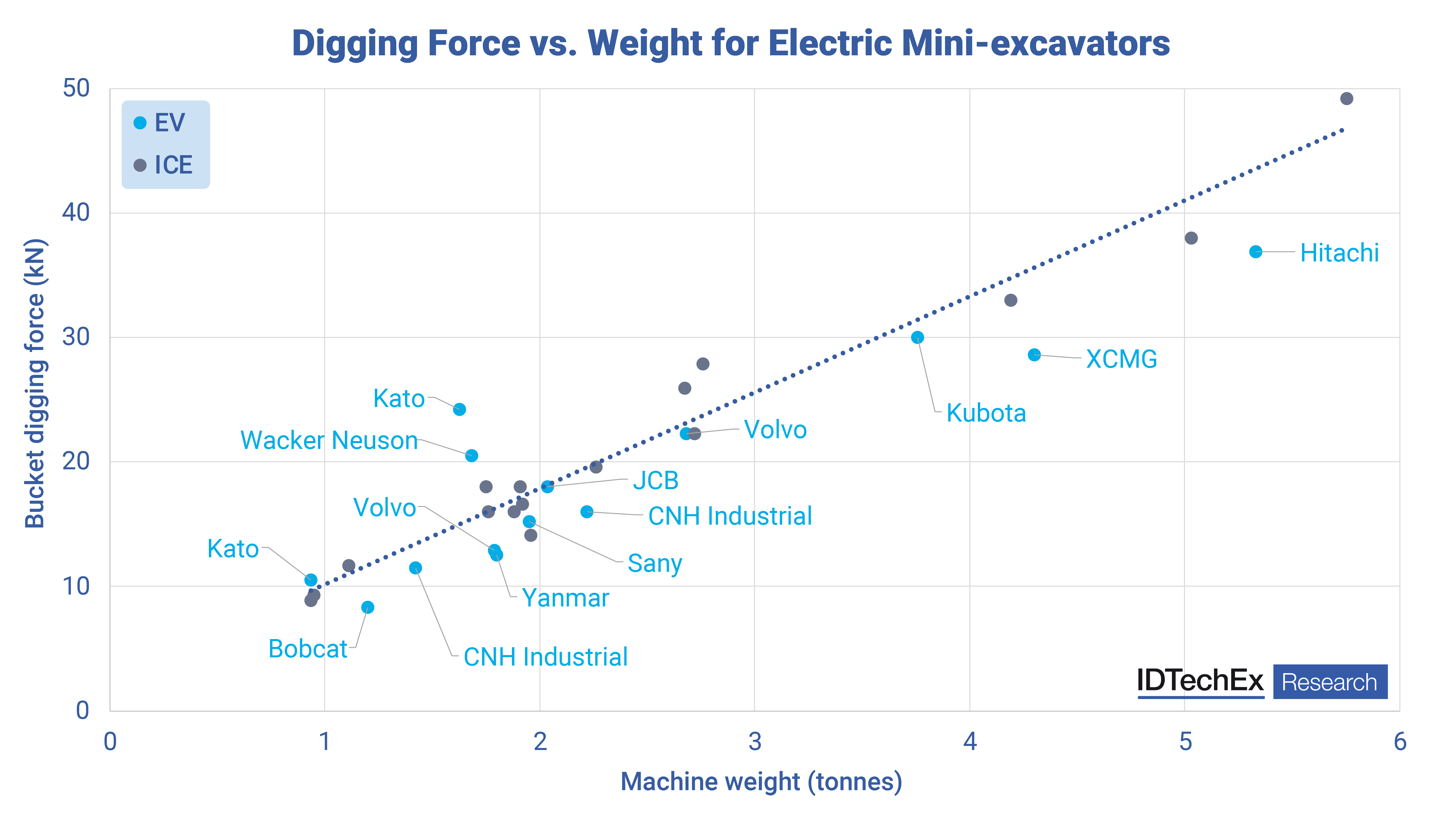 ミニショベルの掘削力比較:電動式 vsディーゼル式。 Source: IDTechEx