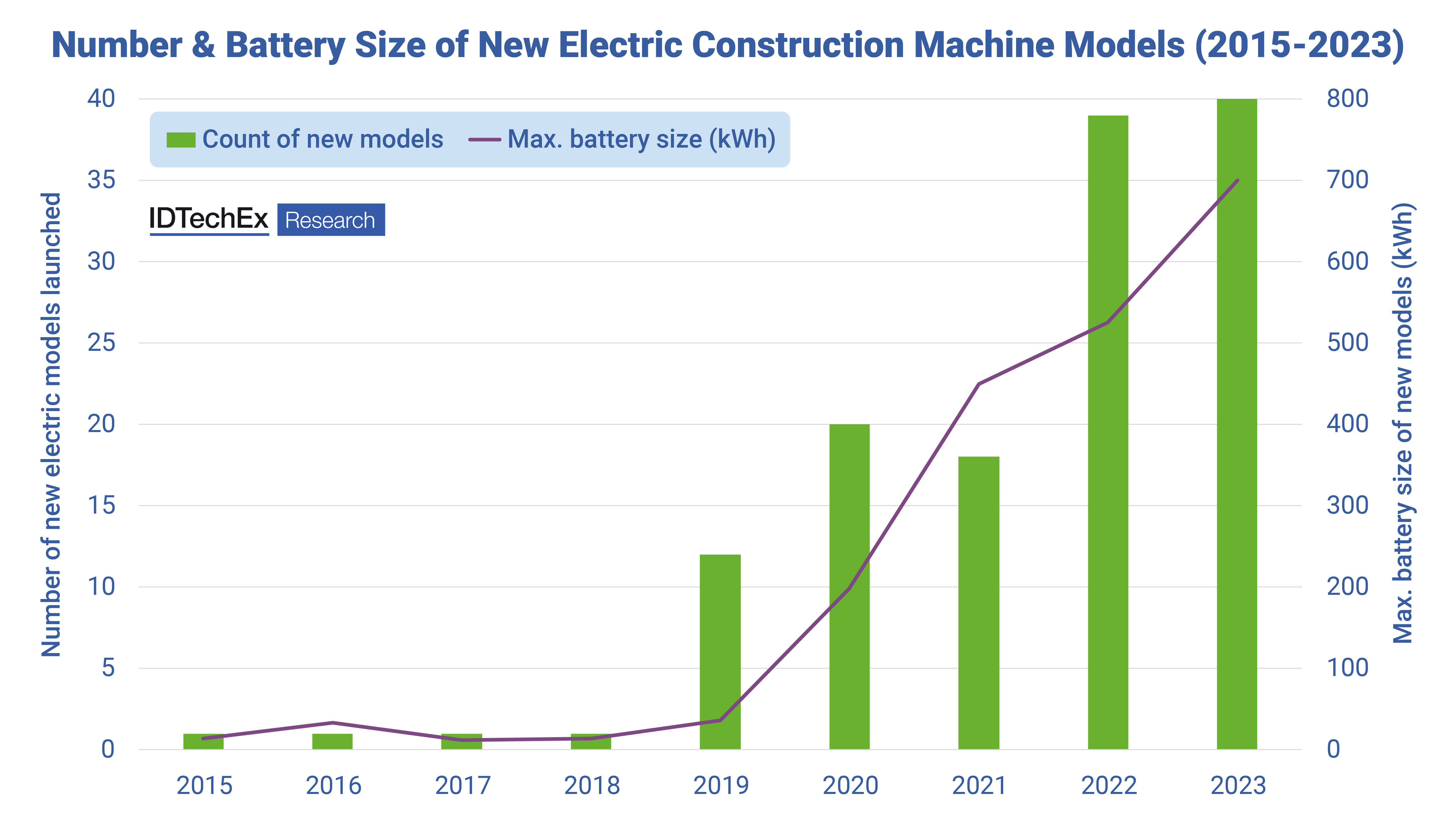 2015~2023年の電動建機の新機種数と最大バッテリーサイズ。 Source: IDTechEx