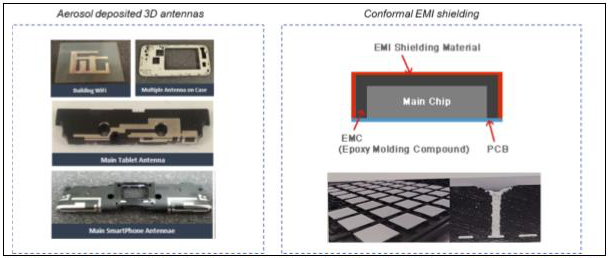 この技術は例えばiPhone 7の数か所の集積回路に既に使用されています。しかし、こうした成膜はスパッタリングされたシルバーをベースにしています。スパッタリングは周知の利用可能な技術であり、導電性が高く、それ故に一定の電磁波シールド性能レベルに対しては薄いラインを実現します。