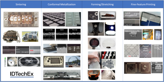 この記事で取り上げている様々のアプリケーション例。焼結: 一番上の画像は銀焼結を利用したリストシステム向けのIGBTモジュールです。上から2番目の画像は、テスラで使用されるSiCインバーターであり、銀焼結を利用しています。上から3番目の画像は、様々な焼結接合部の断面で、上から4番目と5番目の画像は焼結ペーストを提供する際の様々なフォームファクタです。共形メタライゼーション: 一番上の画像は銀メタライゼーションでスプレーコーティングされたパッケージです。上から2番目の画像は3つの異なる粒子形態を利用したスプレーコートメタライゼーションの断面です。上から3番目の画像はパッケージ内絶縁のための噴射ソリューションです。上から4番目と5番目の画像は航空機の上部にあるゾルメタライゼーションを施したアンテナの2つの事例と自動車用LEDヘッドランプです。成形と延伸: 上側の画像のセットは、自動車とコンシューマー・エレクトロニクス業界向けの、インモールドエレクトロニクスを利用して作られた様々な製品と試作品です。そして下側の画像セットはストレッチャブルインクを利用して作られたe-テキスタイルの製品と試作品です。微細印刷: 一番上の画像は、狭線幅に対するハイブリッド型光パターン配向アプローチです。2列目は狭線幅に対するハイブリッド型のエンボス加工アプローチです。3列目は1μm以下の直接印刷のデモです。そして最後の列は低温チップ接着のための孔版印刷によるバンプメタライゼーションです。ここでのトレンドでは、微細なピッチの回路へのメタライゼーションとともにより微細なピッチが求められるようになっています。これらの写真の多くは、IDTechExが世界中で開催されたカンファレンスや見本市で撮影したものです。 Companies whose work is shown include Optomec, Ntrium, Henkel, DuPont, Danfoss, Tesla, Alpha Assembly, Toyobo, TaktoTek, Asahi Kasei, Komura-Tech, Toray, O-Film, Dowa, Bando Chemical, GIS, Fujikura Kasei, MNTech, ConnecTech, J.W. Speaker, Atra Plastics, and others. さらに多くのサンプル紹介は『導電性インク市場2019-2029: 予測、技術、プレーヤー』をご覧ください
