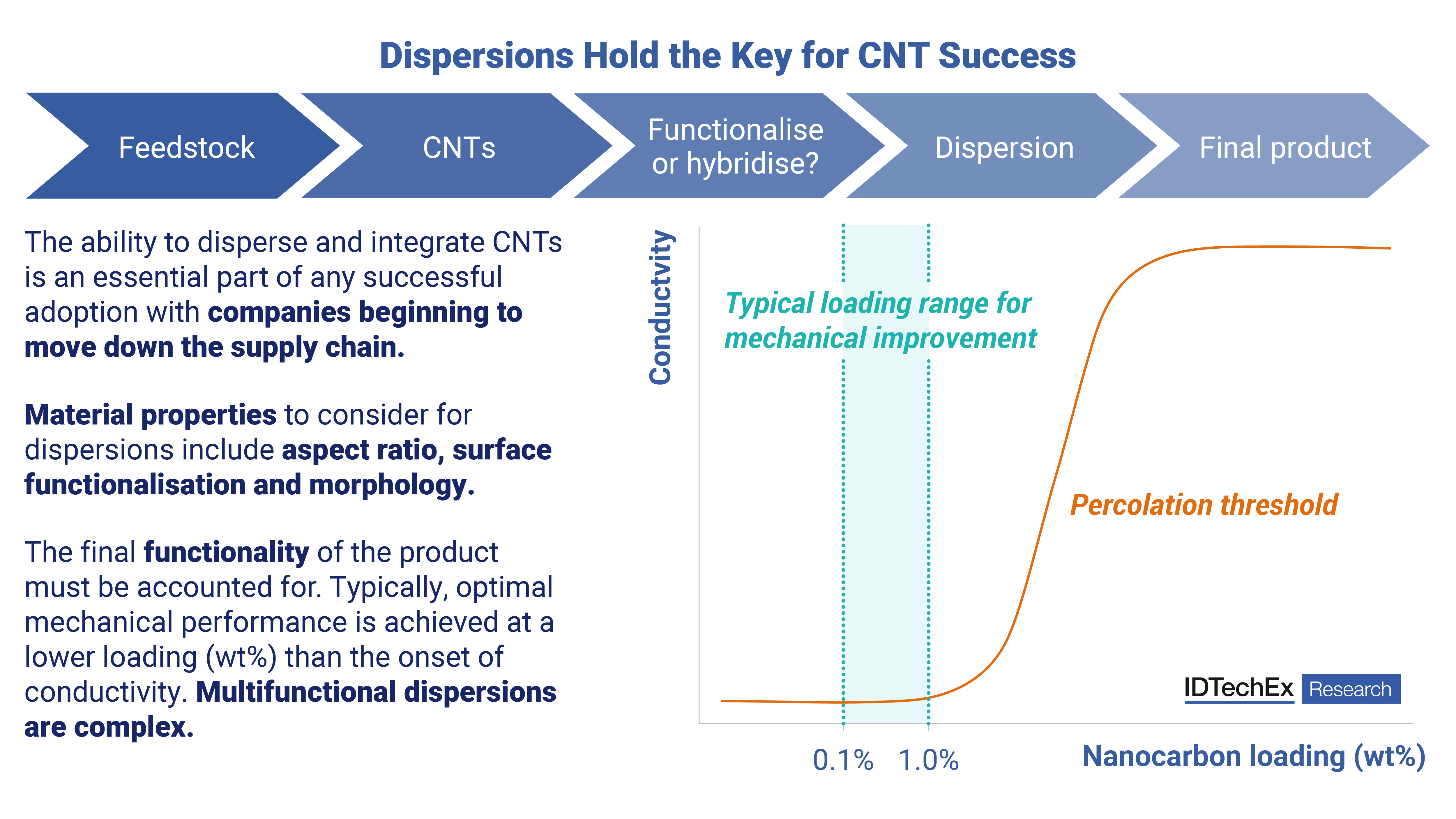 ナノカーボンを高分子複合材料中で分散させるのには、多機能特性を付与するという目的があり、その中でも最も重視されているのが機械的特性です。破壊靭性は亀裂の偏向や架橋などのメカニズムによって高められます。一方、応力や歪みは界面接触を通じて母材からナノカーボン強化剤へと伝わります。その他には、耐衝撃性、層間せん断強度、圧縮強度などの機械的特性の向上も期待できます。機械的特性以外では、パーコレーション閾値以上の少ない充填量(3wt%未満)によって導電性の付与が可能です。多機能導電性を備えることにより、電撃保護、除氷、熱管理などの用途にも採用の可能性を見出せます。