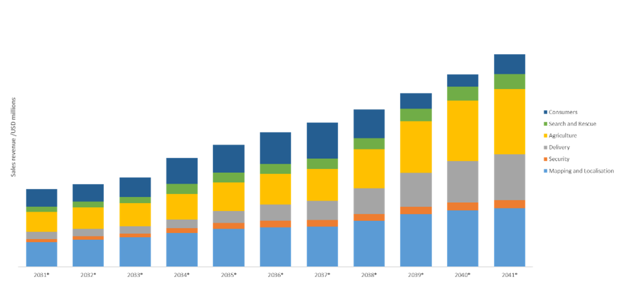 ドローンの売上高 出展: IDTechEx 「ドローンの市場と業界 2021-2041年」
