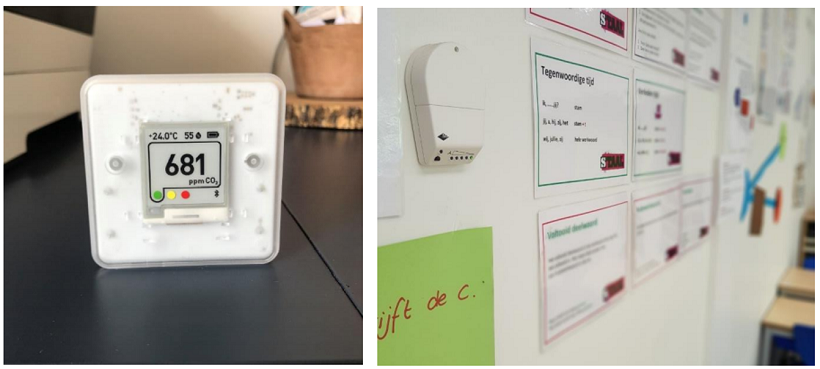 欧州空調換気設備協会(REHVA)も、次の写真のような信号ランプの通知を使ったCO2モニタリングシステムを学校に導入するためのガイダンスを発行しています。