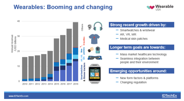 過去6年間ウェアラブル技術分野は非常に大きな成長を遂げました。例えば、スマートウォッチやフィットネストラッカーといった商品の売上高は2013年には10億ドル程度であったものが、2018年には120億ドルを超えるまでになっています。ウェアラブルの多くがMassマーケットを対象とするヘルスケア技術にフォーカスした結果、一部規制緩和の恩恵もあり電子皮膚パッチは50億ドルもの産業に成長を遂げています。