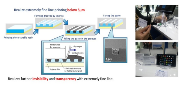 The first commercial use of printing was as a hybrid process by the likes of Shenzhen O-Film. In this hybrid approach, a UV resin is first patterned using imprinting, the trenches are then filled using a printing process such as dispensing, and the excess ink is then cleared off. This creates embedded topographically-smooth metal mesh solutions with sub-5um linewidths. This approach was commercialized although we understood that O-Film had some customer issues in 2015. This approach continues to be developed by O-Film and others. An example demonstrating the process is shown below.