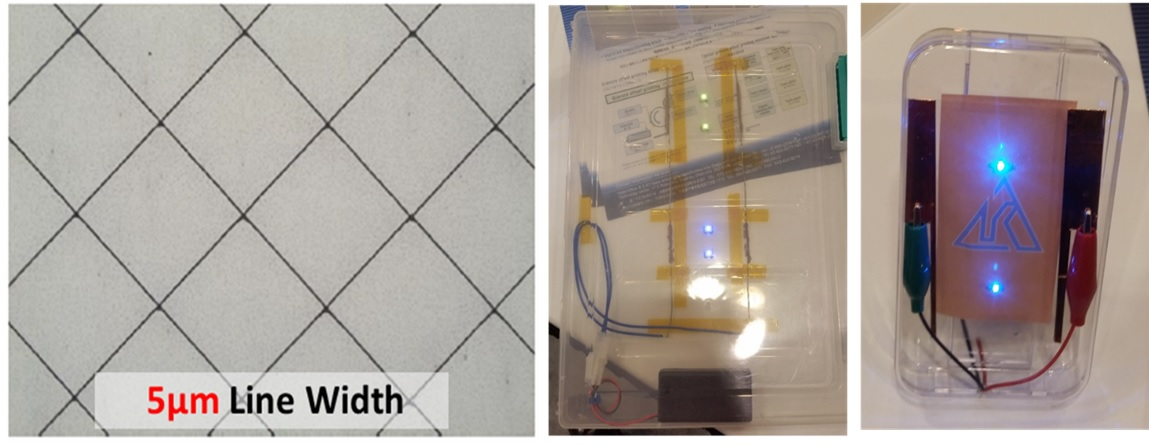 Yet others, such as Asahi Kasei, are developing printing technologies that can directly roll-to-roll deposit lines as narrow 100nm. This technology is currently under development and the prototyping drums have a 100mm diameter and 50mm width. This technology however may be overshooting the requirements of the TCFs, and might be better suited to other applications.