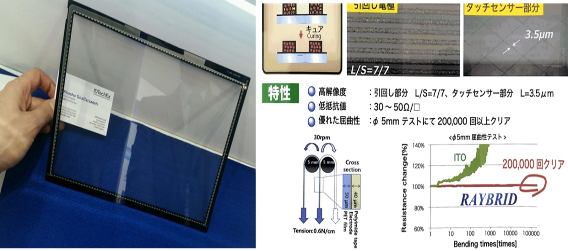 (Right) fine linewidth flexible metal mesh made using Toray's photo-patternable Ag conductive paste. (Left) image of medium-sized TCF where I could detect no visible lines. Source: Toray. I took these photos at Nepcon Japan 2017.