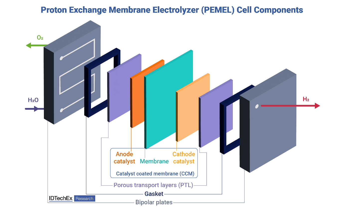 Proton exchange membrane electrolyzer (PEMEL) cell components. Source: IDTechEx