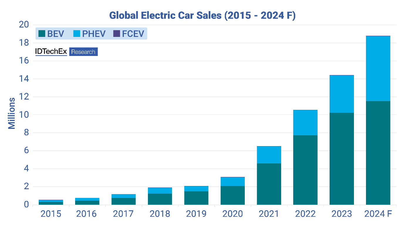 ドライブトレイン別 2015年から2024年までのEV世界販売台数(予想販売台数)。2023年から2024年にかけての成長の大部分はプラグインハイブリッド車(PHEV)の販売台数増加によるもの。出典: IDTechEx - 「プラグインハイブリッドと電気自動車 2025-2045年:技術、市場、有力企業、予測」