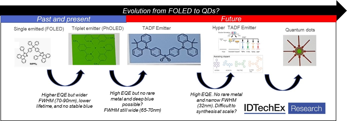 現在、本技術はさらに進化しています。TADF(熱活性化遅延蛍光)材料の開発が進んでいます。この材料技術もすべての状態から(光を)取り出せるので、安定した青色発光体への道を開く可能性があります。ハイパーTADFは、TADFの特性と蛍光色素の特性が融合したまた別の材料です。この材料はIQEが非常に高く、FWHMも狭い反面、低(手ごろな)コスト大量生産に向けての深刻な課題が露呈しています。まだ商業化までは至っていません。