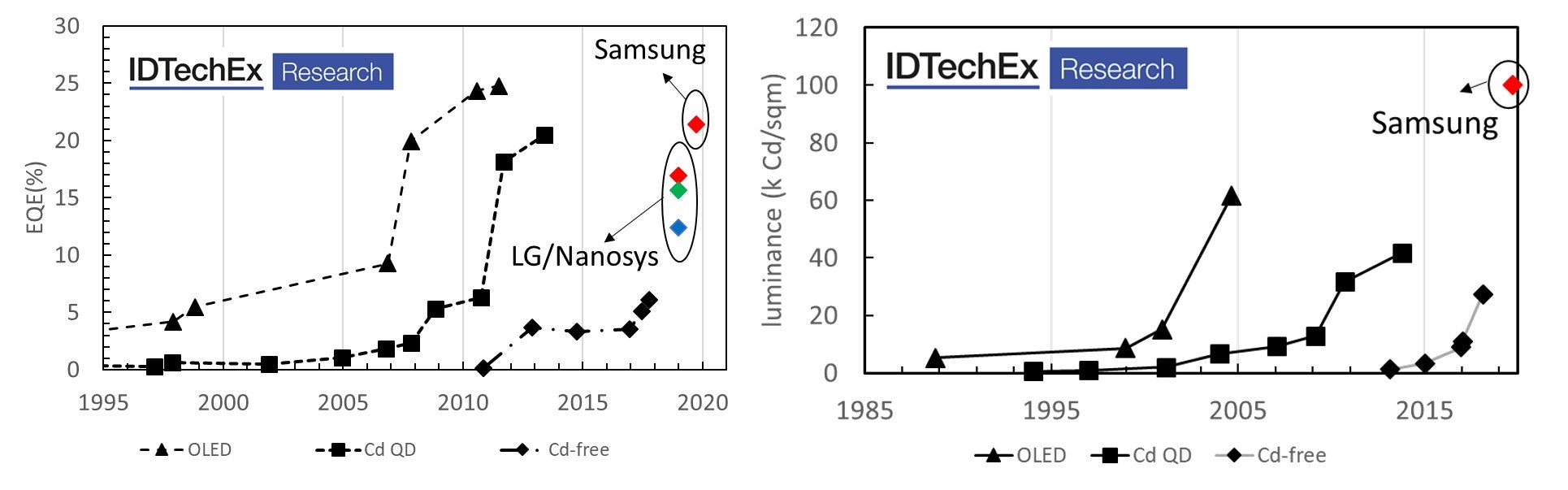 Left and right charts show, respectively, progress in EQE (%) and luminance (k cd/sqm) of OLEDs (filled black triangles), Cd QDs (filled black squares), and InP QDs (filled black trapezoids). The coloured dots are the latest Cd-free results. The color here refers to the color of emission. These charts are modified and updated from figures previously presented by Fraunhofer IAP. The QD picture in figure 1 is taken from Fraunhofer IAP. To learn more about quantum dots please see "Quantum Dot Materials and Technologies 2019-2029: Trends, Markets, Players".