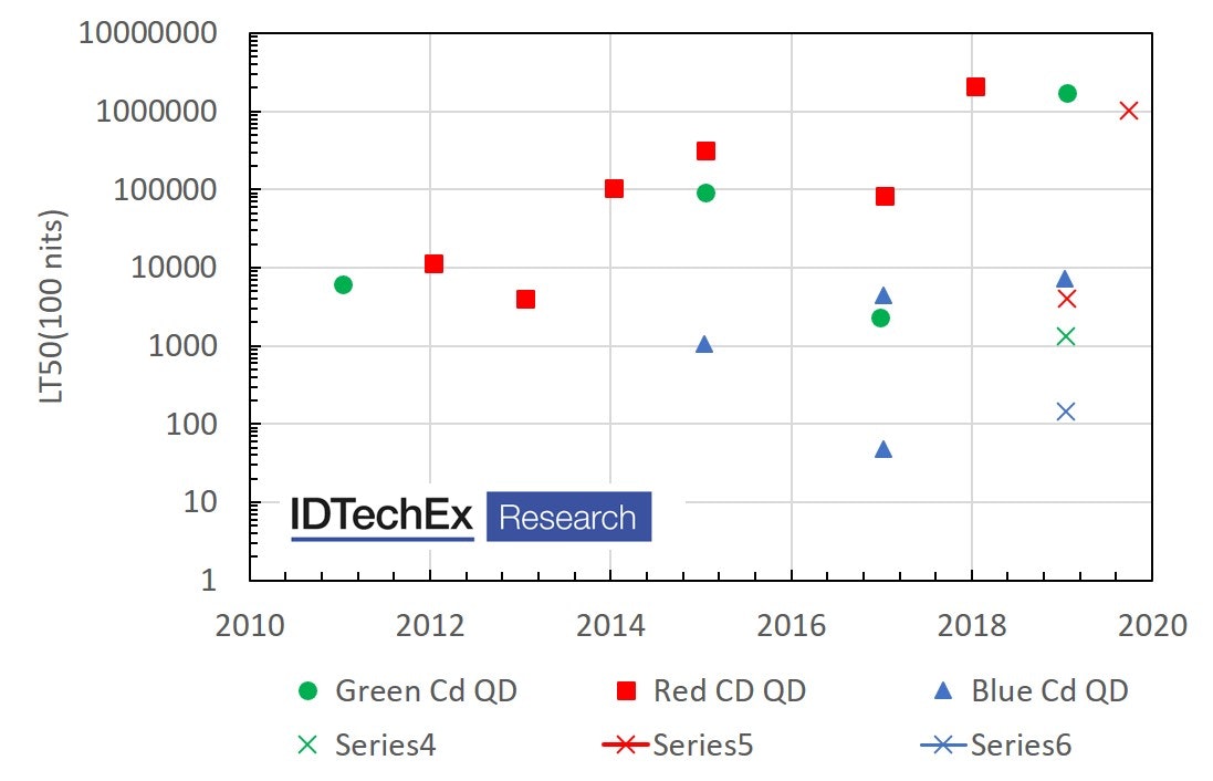 The figure above shows the LT50 lifetime of QLED devices at only 100 nits. The red and green Cd-based QLED have high LT50. The blue is lagging. Typically, Cd-free QLEDs have had very poor lifetime. This is now improving. The results from Nanosys/LGD show LT50 for red, green, and blue, and the Samsung one for red (extrapolated from TL50 at 1k nits). These early-stage works that it might be possible to extend lifetime of Cd-free QDs although there is still far to develop. For more information please see "Quantum Dot Materials and Technologies 2019-2029: Trends, Markets, Players".