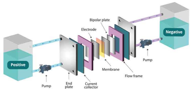 Figure 2: Exploded representation of a redox flow battery, showing the different constituents. Source: Engineering aspects of the design, construction and performance of modular redox flow batteries for energy storage - L.F. Arenas, C. Ponce de León, F.C. Walsh - Journal of Energy Storage (2017).
