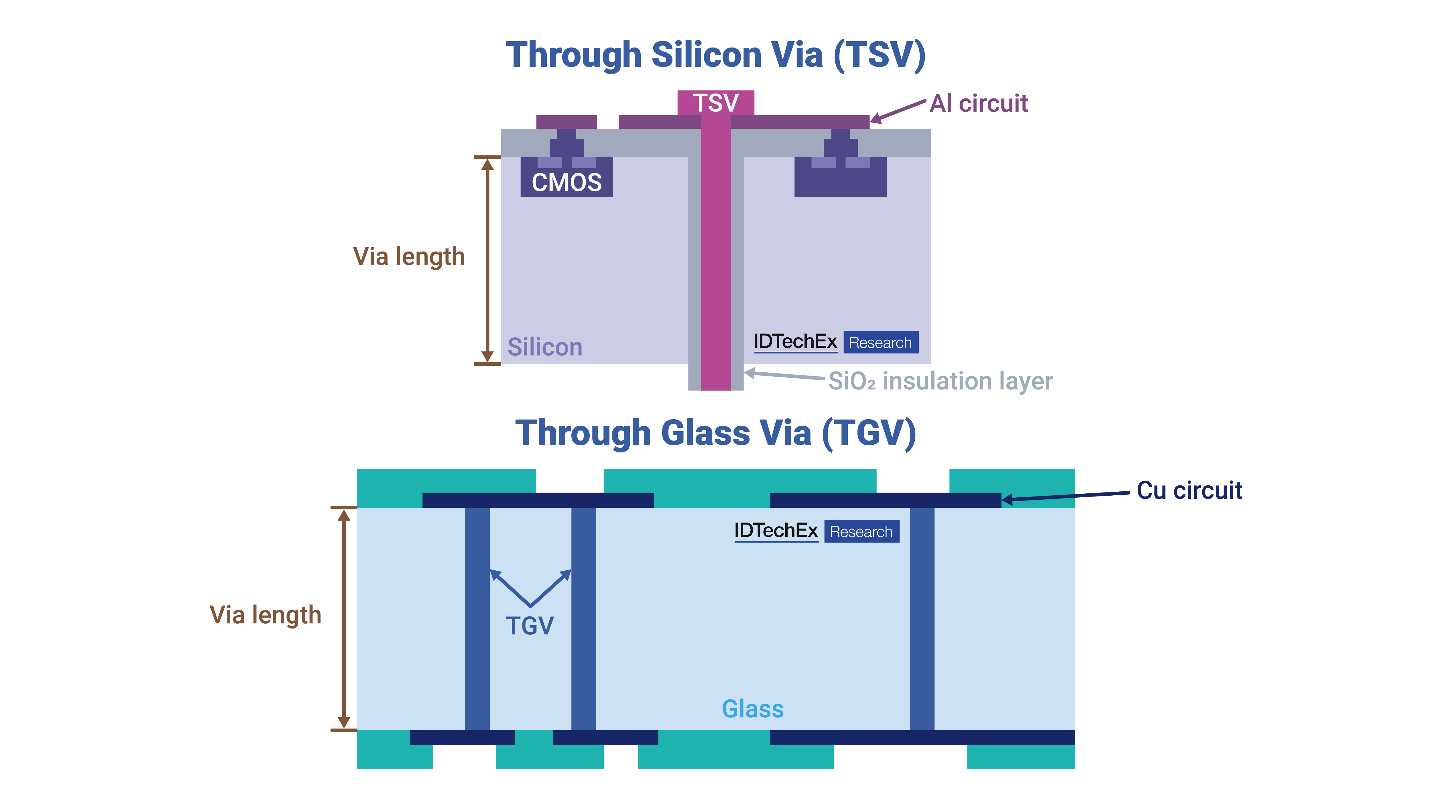 Through silicon via (TSV) on the top and through glass via (TGV) at the bottom. Source IDTechEx