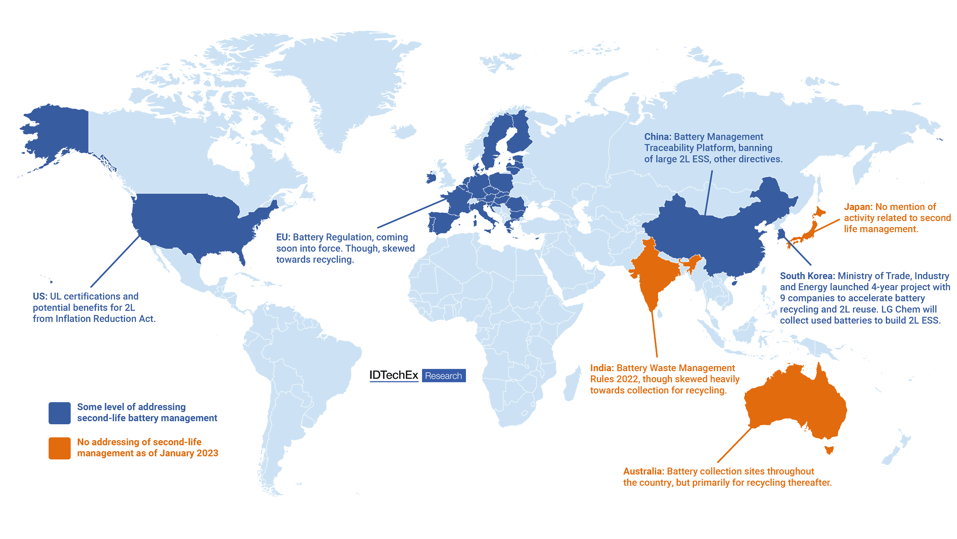Battery End-of-Life issues are recognised as a key topic for the sustainability of the EV industry. While there are some regulations on the recycling/disposal of batteries in general, few regulations exist that specially address the second use of EV batteries. Realising the importance and the potential value brought by second-life batteries, regions including Europe, China and the US are working on their regulatory frameworks to facilitate B2U. The report discusses EU, Chinese and US legislation, including IDTechEx's views on the soon-to-be-adopted EU Battery Regulation and how introduction of the battery passport could cause shifts in player activity.