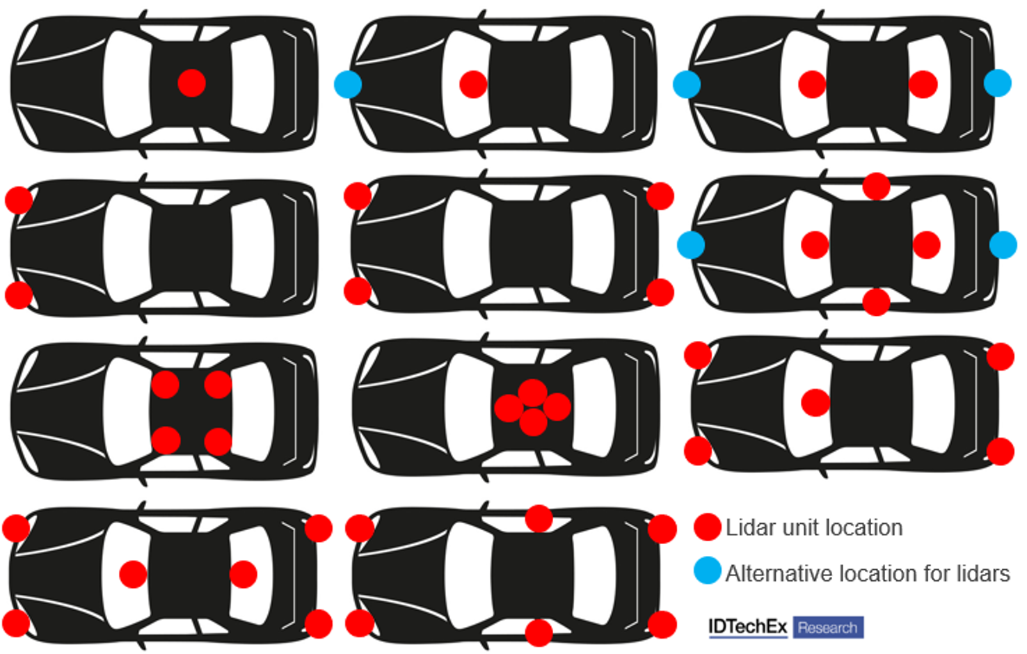 Examples of lidar configurations considered in our market analysis and forecasts for level 3+ autonomous vehicles. Source: IDTechEx