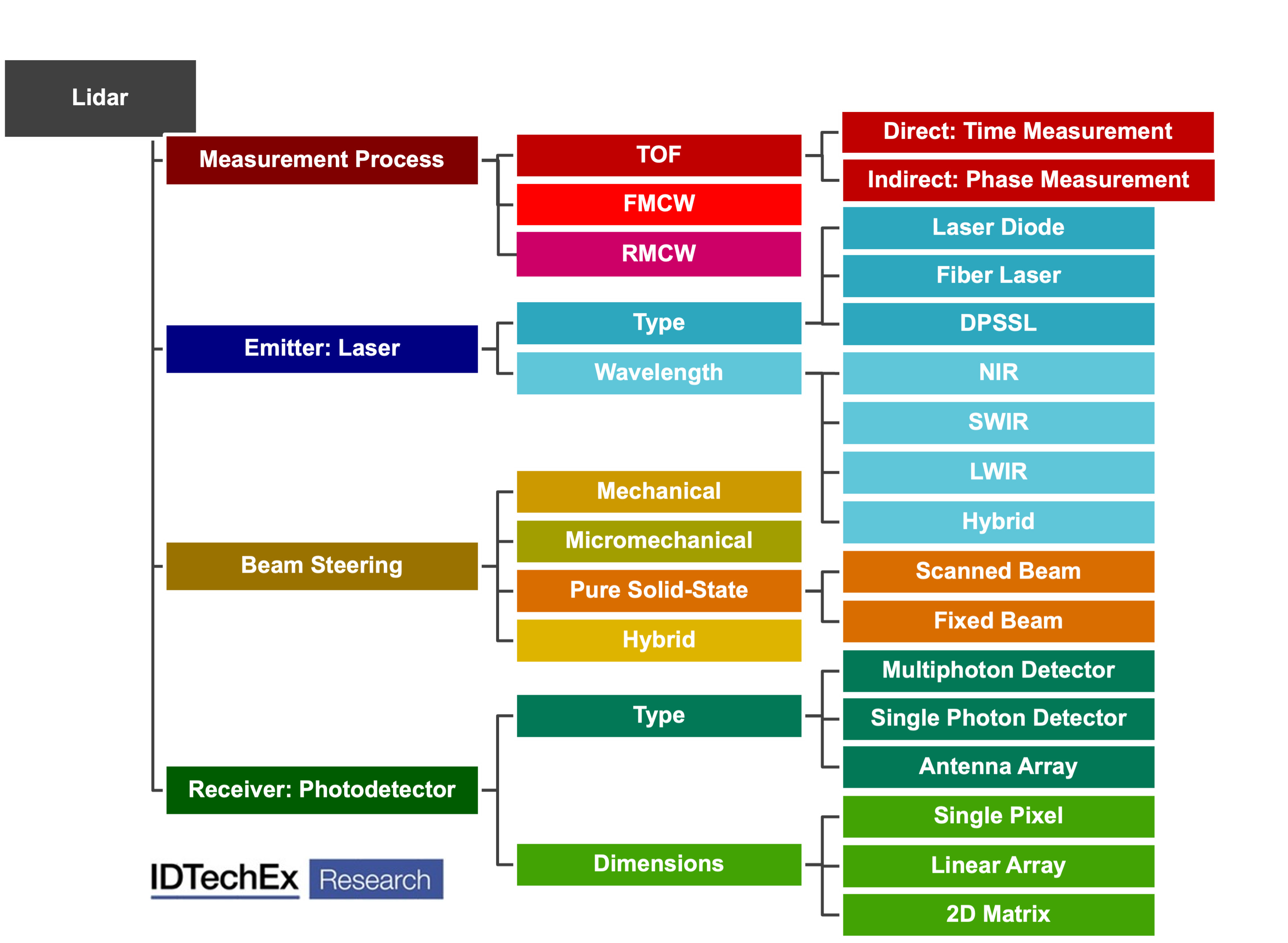 3D lidar is an optical perception technology that enables machines to see the world, make decisions and navigate. At present, machines using lidar range from small service robots to large autonomous vehicles. The rapidly evolving lidar technologies and markets leave many uncertain questions to answer. The technology landscape is cluttered with numerous options for every component in a lidar system. IDTechEx identified four important technology choices that every lidar player and lidar user must make: measurement process, laser, beam steering mechanism, and photodetector. The beam steering mechanism is the most complicated and critical choice, while the emitter and receiver (transceiver) play an important role in future lidar cost reduction and further performance enhancement.