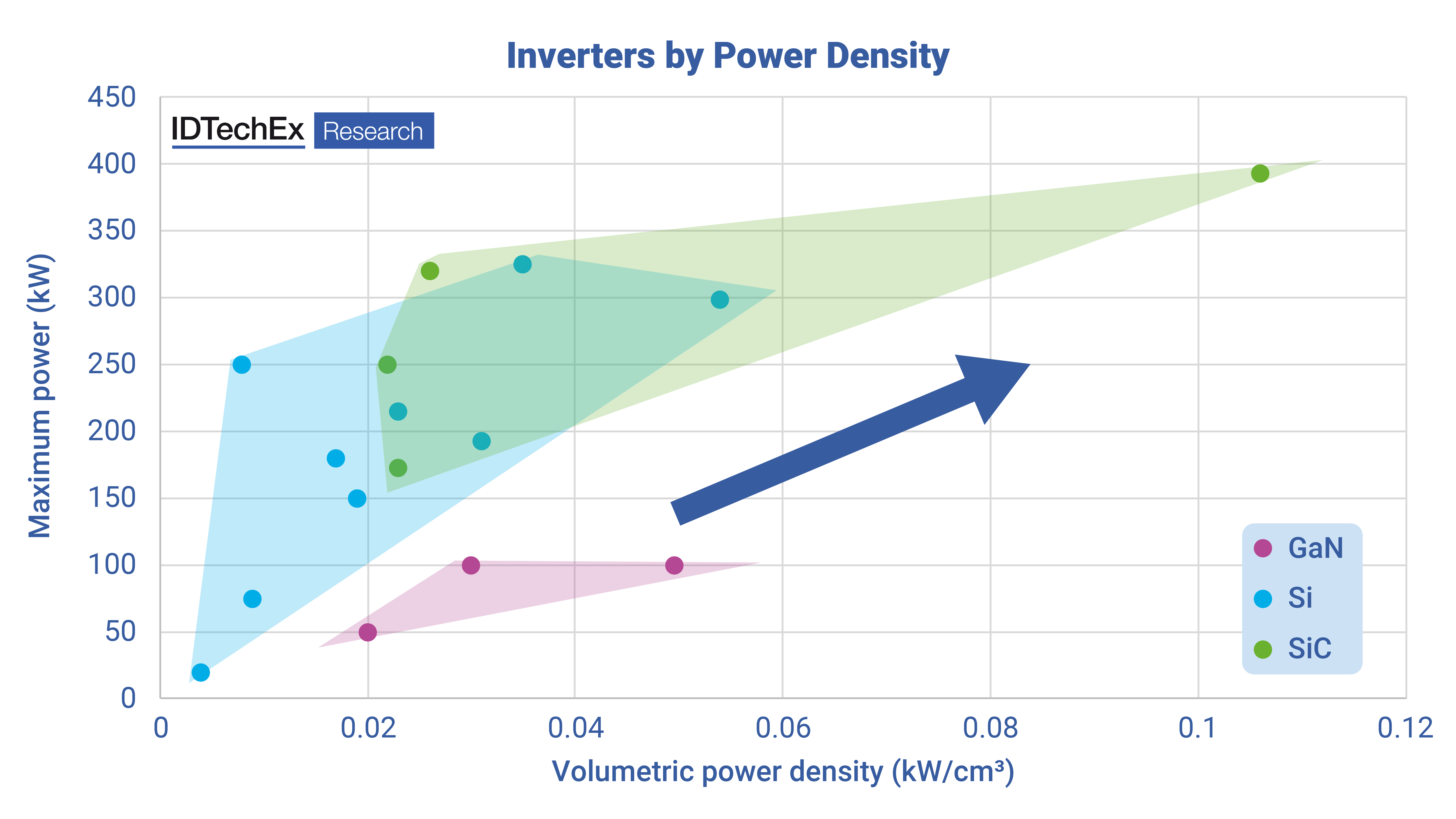 IDTechEx benchmarks traction inverters that deploy different semiconductor technologies, the arrow indicating the future progression of GaN traction inverters. Source: Power Electronics for Electric Vehicles 2026-2036