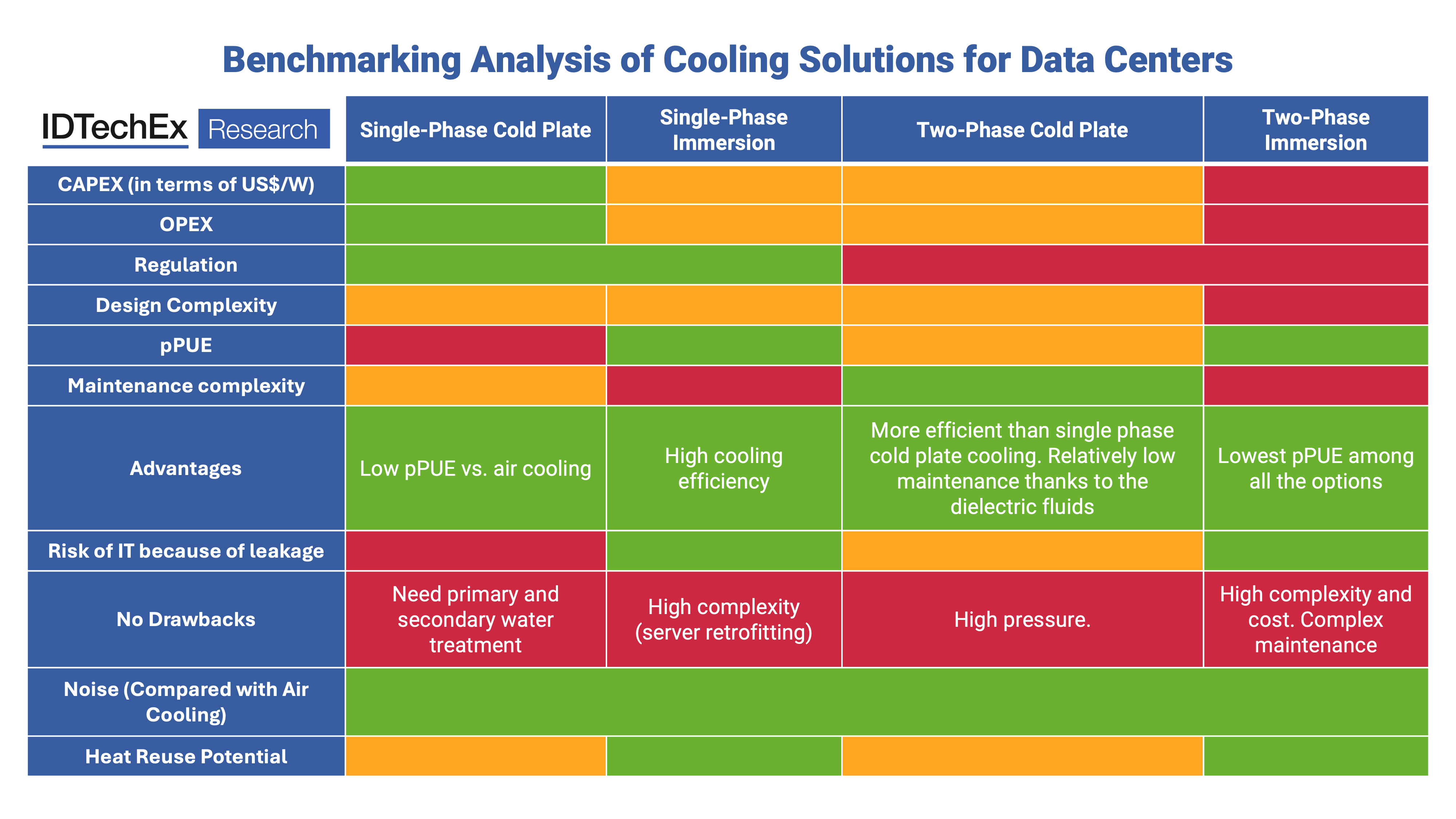 Source: Benchmarking analysis of cooling solutions for data centers. Source: IDTechEx's "Thermal Management for Data Centers 2026-2036"