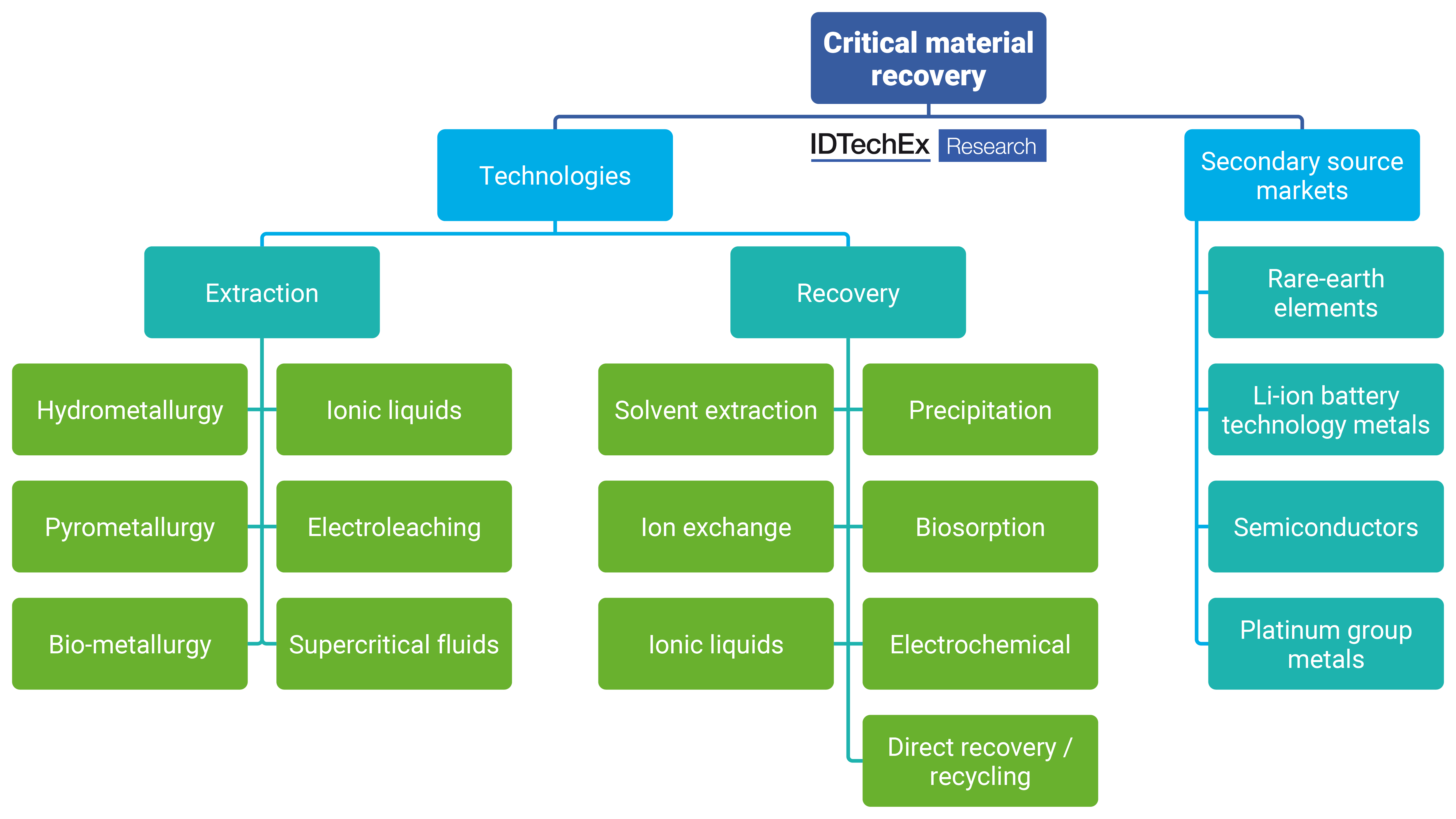 Critical material recovery from secondary sources looks to alleviate growing global material supply risks and their impact on regional economies. Critical materials, such as lithium, nickel, cobalt, rare-earths elements, platinum group metals, silicon and other semiconductors underpin all modern technology. However, the high geographical localization of critical material market supply chains - both primary critical mineral deposits and processing steps - presents major risks to many global economies. These factors are creating a strong market pull for critical material recovery technology that utilizes secondary raw materials as an alternative to primary sources.